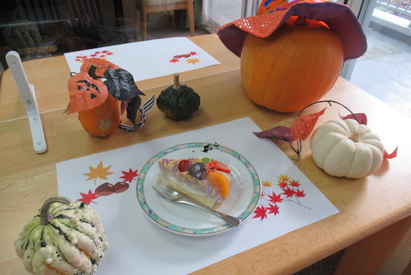 | 本日ご用意したのは「フルーツファクトリー」のケーキになります。 ハロウィンの日も近いためケーキも紫いものカラフルなクリームやクモの巣模様のチョコレートムース等ハロウィンならではの物があり、ケーキフィルムにも魔女のシルエットがあしらわれていました。 会場でもテーブルの周りにカボチャなど飾り、コーヒーを飲みながら秋のアイムス喫茶でハロウィンの雰囲気を楽しんでいただきました。 |