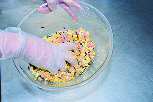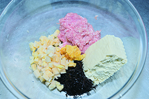 ボウルにタケノコ、ヒジキ、木綿豆腐、鶏ひき肉、おろし生姜、片栗粉、しょう油、塩を入れてこね、さらに溶き卵を加えてこねる