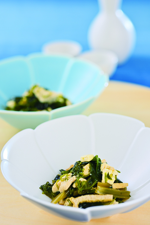 ワカメ、茎ワカメ、メカブとそれぞれ食感のことなるワカメで季節を堪能! 白和えに使う豆腐はざっくり崩す程度が見た目もよく、味も引き立ちます。クリームチーズを加えた和と洋のハーモニーにご注目を。