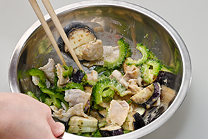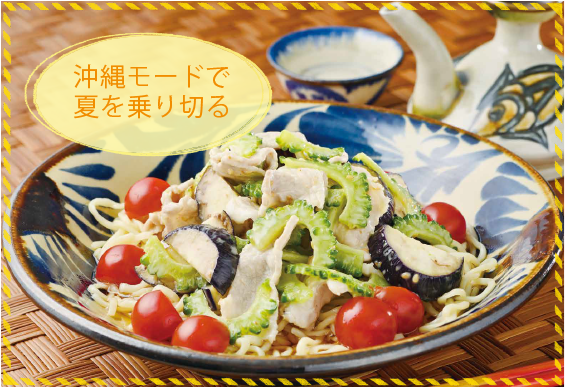 沖縄料理で「肉」といえば豚肉。体内で糖質をエネルギーへ変換する時に必須のビタミンB1が豊富で、疲労回復効果が! ゴーヤー&ナスを茹でてゴマダレで和え、リッチな冷やし中華に仕上げました。