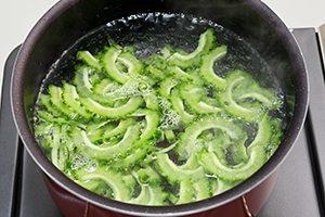 ゴーヤーを縦1/2に切り、スプーンで種とワタをこそげ取り、厚さ5㎜にスライス。塩一つまみを入れた熱湯で1分間茹で、水でさらす