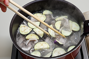ナスを縦1/2に切り、厚さ5㎜にスライス。豚肉は食べやすい大きさに切っておく。熱湯を沸かし、ナス、豚肉の順に火を通し、ザルにあげて粗熱をとる