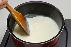 鍋に調整豆乳、牛乳、砂糖を入れて弱火で温める。温まったら①を加え、ゼラチンが溶けるまで木ベラで混ぜ合わせる
