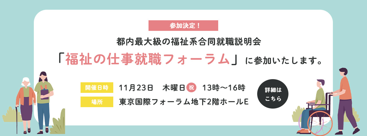 | 2021.05.27 | 令和3年度東京都介護職員就業促進事業受け入れ事業所に認定されました。 無資格で介護職のお仕事をお探しの方に向けた支援となります。詳しくはこちら |