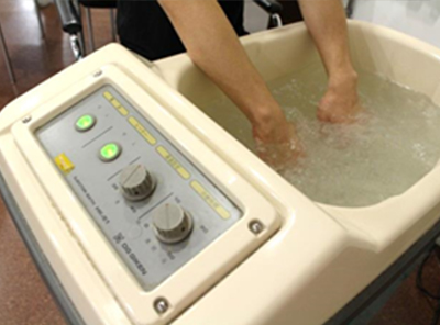 腕や足の一部を、温水の入った浴槽につけ、噴射した過流を患部に当てます。
