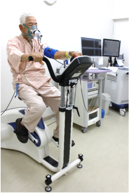 心肺運動負荷試験(以下CPX検査)とは、エルゴメーター(エアロバイクのようなもの)を用いて運動負荷をかけながら、リアルタイムの心電図と呼吸分析装置による計測を行います。 医師と検査技師が中心に、狭心症状の検出・運動耐容能(全身の体力)の評価・代謝循環評価を行います。