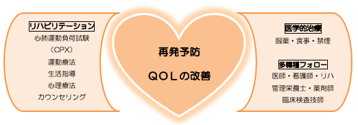 心臓リハビリテーションとは、「心血管病の患者様が快適な社会生活を取り戻すための総合的なプログラム」です。“再発予防”と“QOL(生活の質)の改善”を目的に、患者様個々の状態に合わせたリハビリテーションを包括的に実施します。