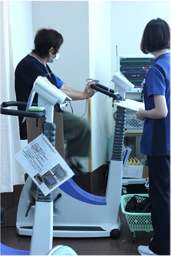 体調に合わせ、心電図をモニターで確認しながら、20分前後のエルゴメーターを用いた有酸素運動を行っています。