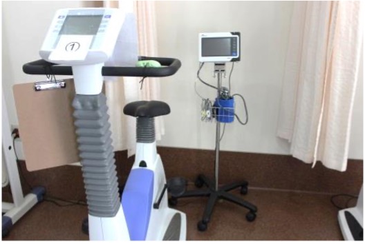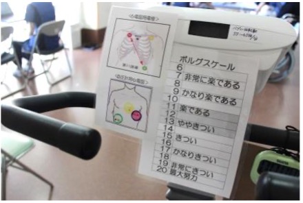 運動(エルゴメーター)を安全な強度で行える負荷の指示が出されます。
