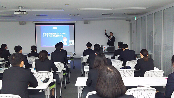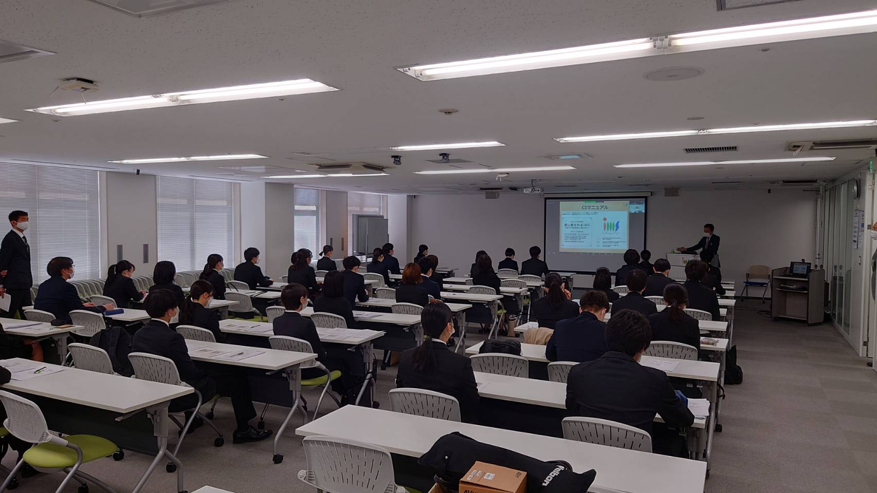 令和4年度入職の放射線技師41名を対象に新入職研修会を行いました。はじめに、七海人事部長より『社会人になる!』という演題で動画にて講話して頂き、次に先輩技師が講師となり『学生と社会人の違い』『コミュニケーション』『礼儀・名刺交換』『敬語』『電話対応』の講義を行いました。講義は新人同士で自己紹介をしたり、折り紙を並べたりといったゲーム的要素も多く、交流も図れる講義内容でした。
