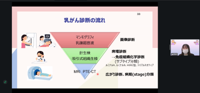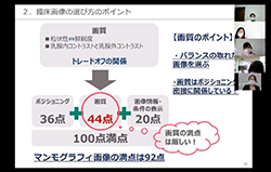 金丸妙子技師にマンモグラフィ読影力向上への取り組みの報告と、三愛会総合病院の斎藤祐子技師に、移転した三愛会総合病院を動画にて紹介していただきました。アイスブレイクでは、アンケート機能を利用して参加者の交流を図り有意義な会となりました。