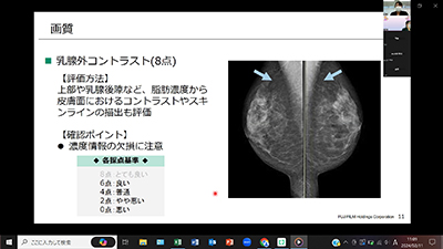 第17回アイリス会研修会では『マンモグラフィ施設認定』をテーマとし、17施設65名の女性放射線技師が参加しました。富士フィルムメディカル株式会社より講師をお招きし、認定取得までの流れや提出する臨床画像選定について、実際のA判定の画像を参考にポジショニングや画質など判定を左右するポイントをわかりやすく解説していただき、今後の施設認定取得、認定更新に役立つ内容でした。Zoomでの研修会は今回が初めてとなり不慣れな運営ではあったが、地方の施設の技師も参加できる今回の形式は今後の研修会の在り方を検討する上でも意義のある会となりました。次年度も様々な企画で研修会を開催し、知識・技術の向上と会員相互の交流を深める一助となれればと思います。