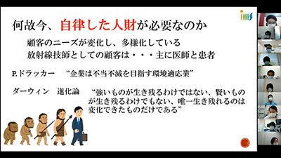 まだまだ暑さが残る9月18日にZoomにて「放射線部管理職研修会②」が開催されました。この研修は、イムスグループ放射線部の管理職として知り得なければならない管理業務に焦点を当てて、計2回の研修カリキュラムの中の2回目でした。今回の研修内容は、『人事管理』と『目標管理』を新松戸中央総合病院の沼井康技師長に、『医療被ばく管理』をイムス富士見総合病院の有山利弘技師長に講義を行って頂きました。Zoomでの研修であったが、それぞれの講義内容は密であった為、21名の参加者は熱心に聴講する姿がみられました。