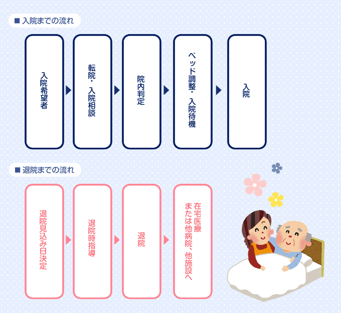 - 退院は原則として主治医の判断により決定いたします。退院希望日はお早めにお申し出ください。
