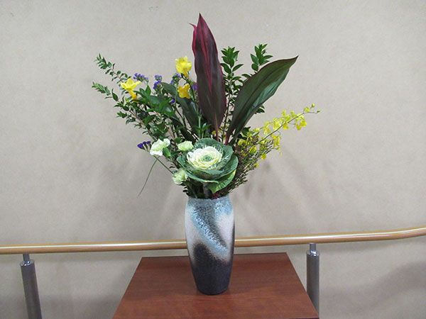 前回はひな祭りアレンジで赤やピンクの明るいお花でお作りしましたので、今週は濃い赤のユリやカーネーション、 紫のアルストロメリアやシネンシス、そこへ鮮やかな黄色のバラを入れシックな感じでお作りしました。 黄色いバラの花言葉は、「友情」「思いやり」「幸福」「温かさ」。 アルストロメリアの花言葉は「持続」「エキゾチック」です。 |