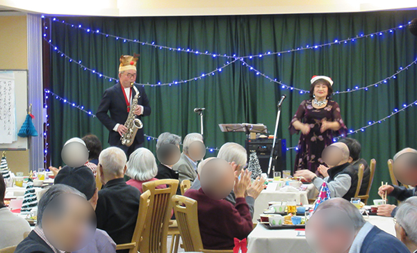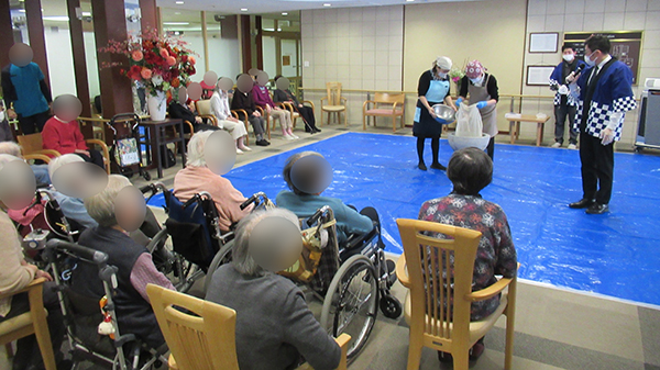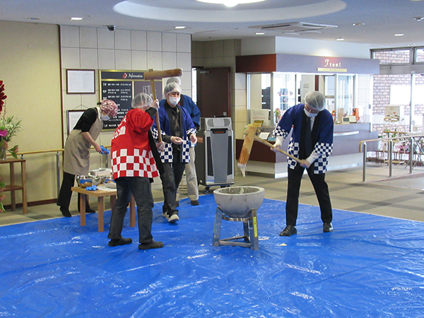 クリスマスが終わると早々とお正月の準備がはじまります。 今日は餅つきが行われました。 職員が力強く杵を振り下ろすたび「ヨイショ」と掛け声が上がります。 今年もあんとみたらしで皆さんに召し上がっていただきました。 「今年はとってもやわらかいわね」「今年もおいしいね」とあっという間に用意したお餅がなくなりました。 |