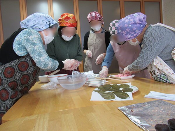 本日の調理レクでは、春の香りを楽しめる桜餅づくりを行いました。 桜の葉の香りに「いい匂い」と笑顔が広がり、あんこを包んだりと、皆さま手際よく作業されていました。 出来上がった桜餅はふんわり優しい味わいで、「おいしい」「また作りたい」と大好評。 お茶を囲みながら、春の話題で和やかな時間を過ごしました。 |