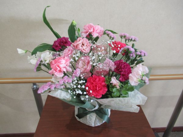 今週はカーネーションやトルコキキョウ、カスミソウなど、定番で人気のあるお花でコンパクトなアレンジをお作りしてみました。 トルコキキョウの花言葉は「優美」「希望」「すがすがしい美しさ」「永遠の愛」「感謝」、 カーネーションの全体的な花言葉は「無垢で深い愛」「純粋な愛情」「感動」、「感謝」「幸福」「清らかな心」「無邪気」「親切」。 素敵な花言葉ばかりです。 | ||