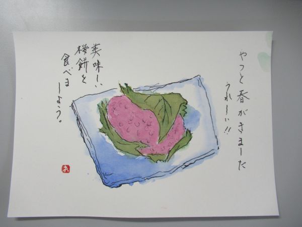 今日の絵手紙教室では、春らしい題材「桜餅」を描きました。 まずは本物の桜餅をテーブルに置いて、じっくり観察。 葉っぱの色や桜色の表現に皆さんが夢中になり、教室はとても和やかな雰囲気に。 仕上がった作品を並べると、それぞれの“春”がふんわりと広がり、心まであたたかくなる時間になりました。 |