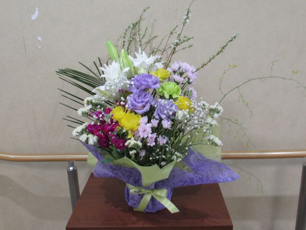今週は珍しいオレンジのディスパットマムやユキヤナギ、トルコキキョウなど、少し和風な感じの花束をお作りしました。 トルコキキョウの花言葉は「優美」「希望」「すがすがしい美しさ」「感謝」「永遠の愛」、ディスバッドマム(1本の茎に1つの大きな花を咲かせた菊)の花言葉は「優美」「希望」「すがすがしい美しさ」「感謝」「永遠の愛」です。 |