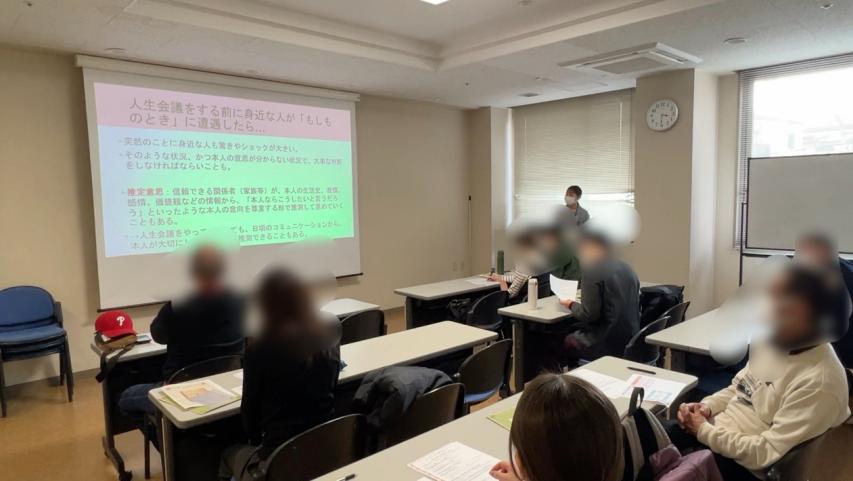 講義では、心理士の役割を紹介したうえで、人生会議(ACP)の概要や必要性、事前に話し合う意義について解説。また、人生会議に対する不安や誤解に触れながら、話し合いを進めるための5つのステップや記録・見直しの重要性、さらには横浜市の取り組みである「もしも手帳」についても紹介しました☺