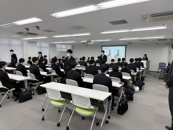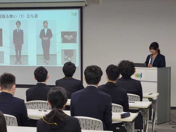 人事部長の講話から始まり、コミュニケーションや礼儀、名刺交換、敬語、電話対応など社会人として必要なマナーについて学びました。