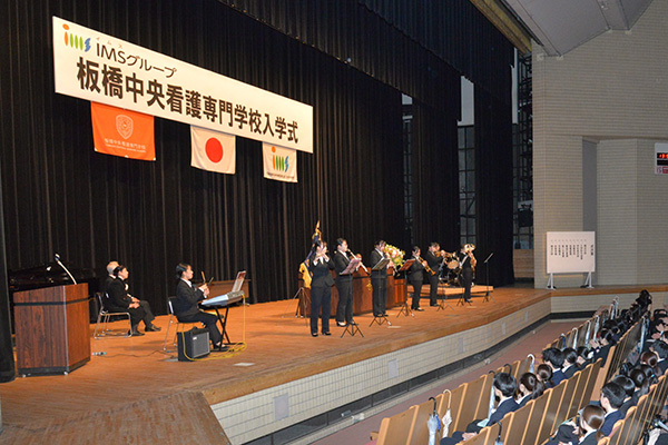 あいにく小雨が降る中での入学式でしたが、来賓の皆さまや教職員、在校生、保護者の皆さまに見守られ、あたたかい雰囲気の中、式が執り行われました。式の最後には板看ウィンドオーケストラによるウェルカムコンサートが開かれ、明るい演奏で新入生を歓迎しました。