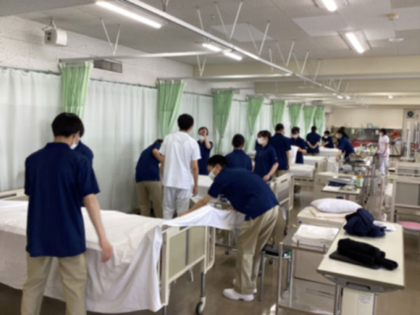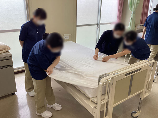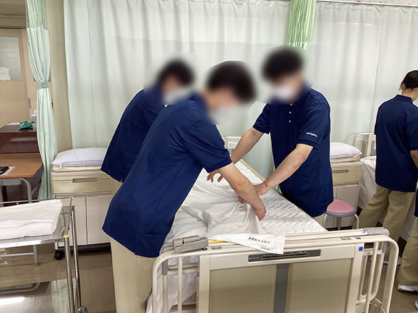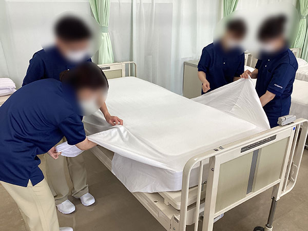 先生のデモンストレーションを参考にしながら、必要物品の準備~最終的にベッドを整えるまで実施しました。