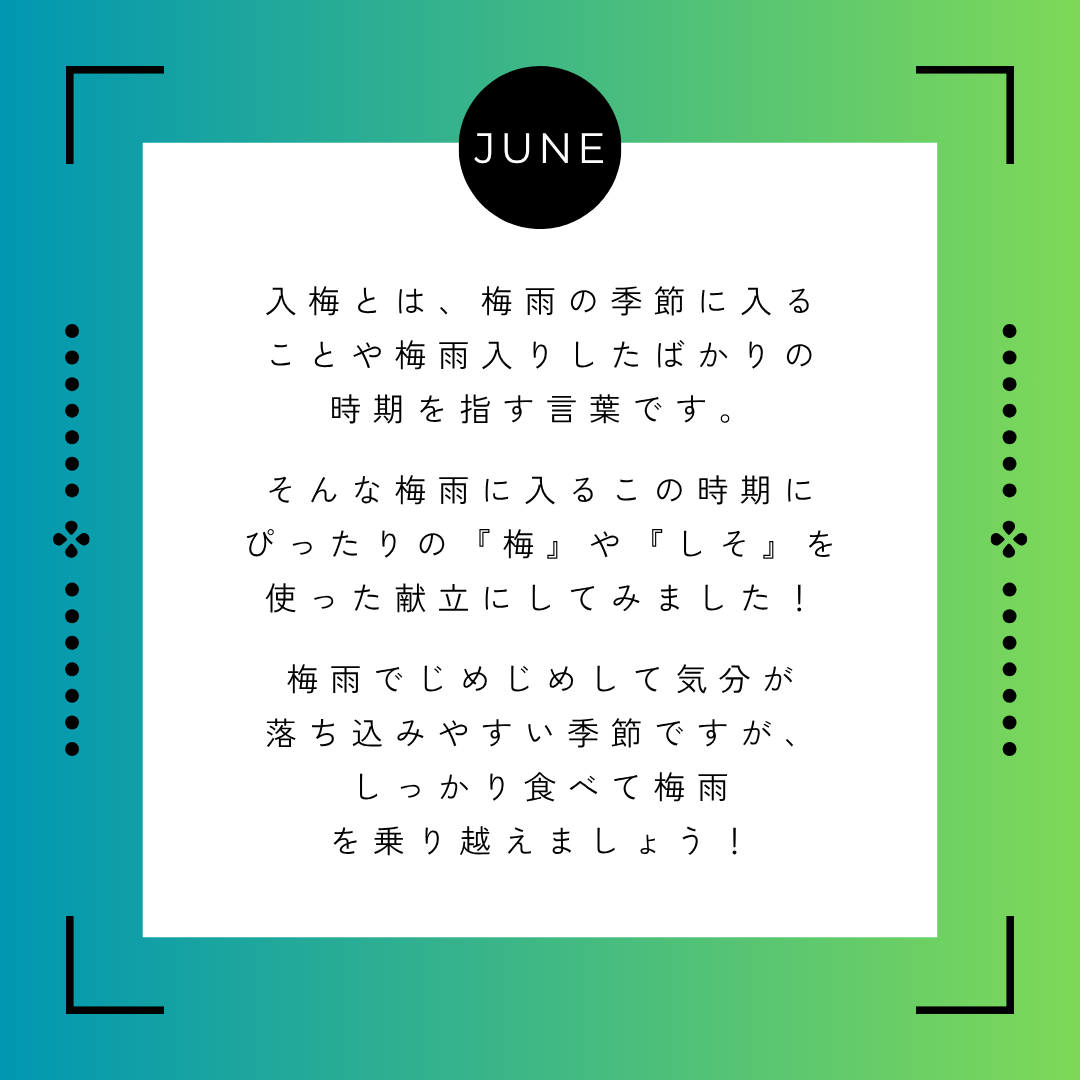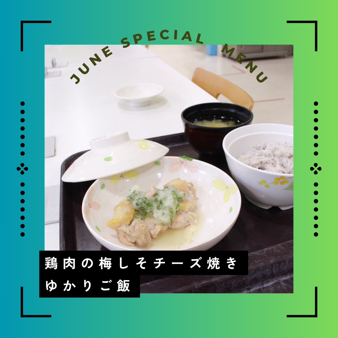 梅雨の時期によく食べる味として、梅やしそを使った酸っぱいものをイメージする方もいらっしゃるはず。板リハの行事食でも、梅としそをポイントにしたお膳をご提供しました。