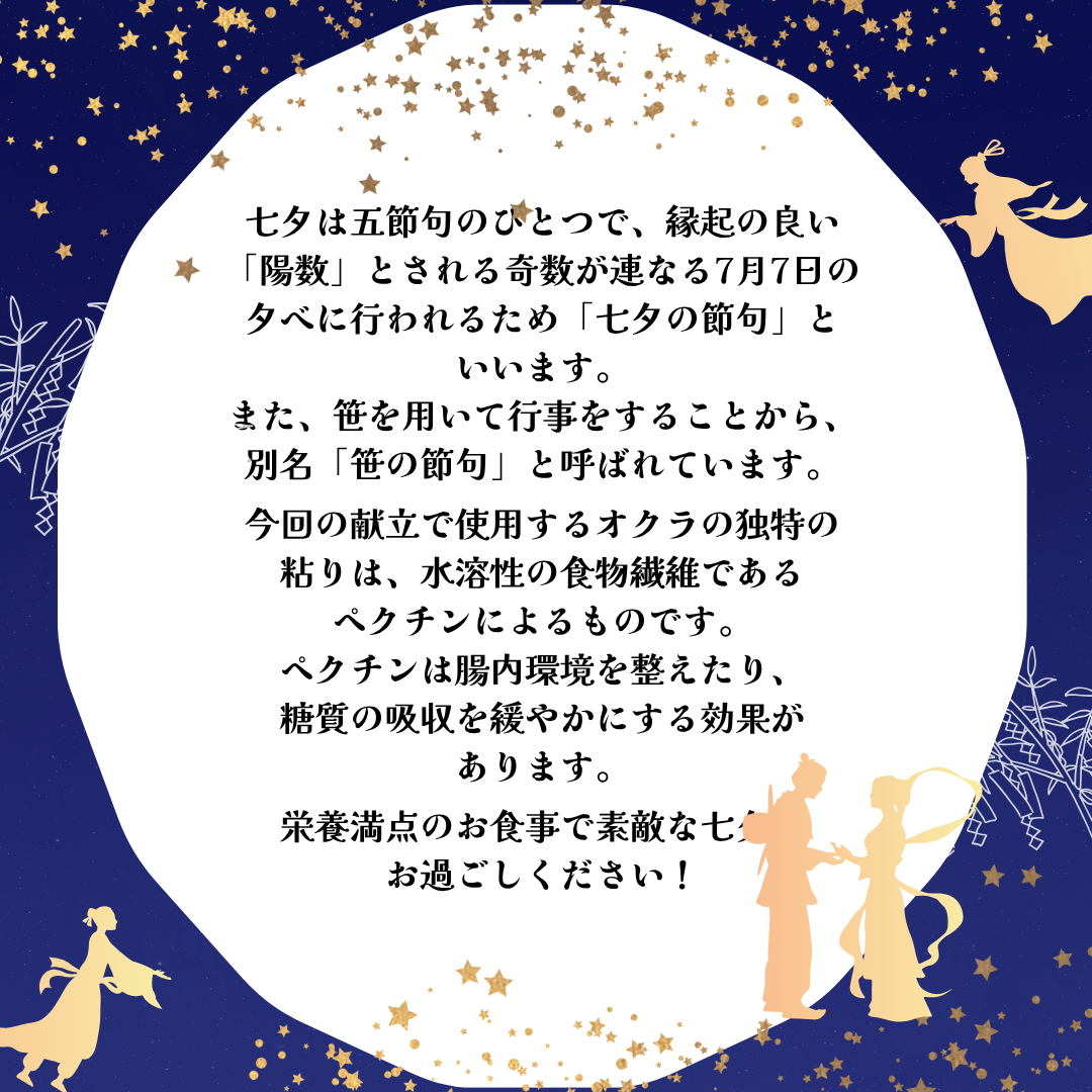 夏が旬のオクラから星をイメージ。さらに、すまし汁のニンジンもお星さまをかたどっています。デザートは、お星さまゼリーを添えました。