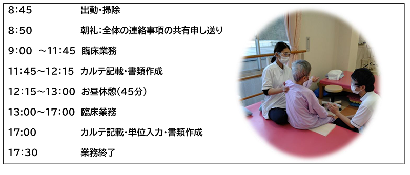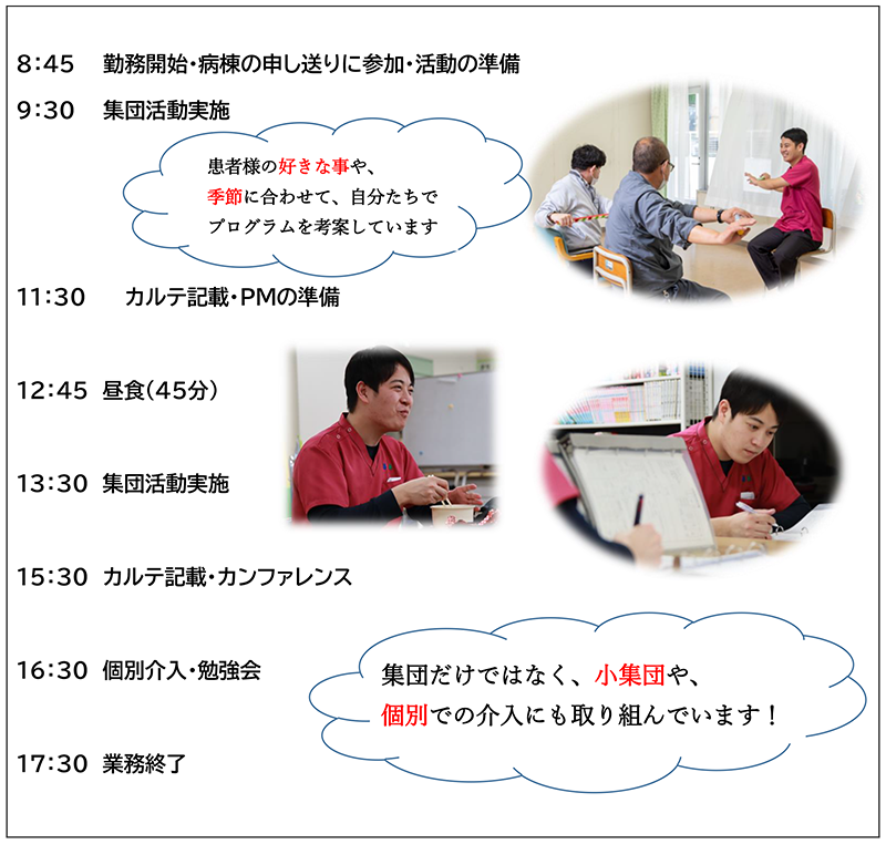 | 4月 | 業務研修(一日の流れ、カルテの書き方など) 集団作業療法見学・患者様介入 、 軽介助患者様の離床 病棟の朝の申し送りへ先輩と参加、 OT スタッフへ申し送り練習 カルテ記入練習( 2 名程) |
