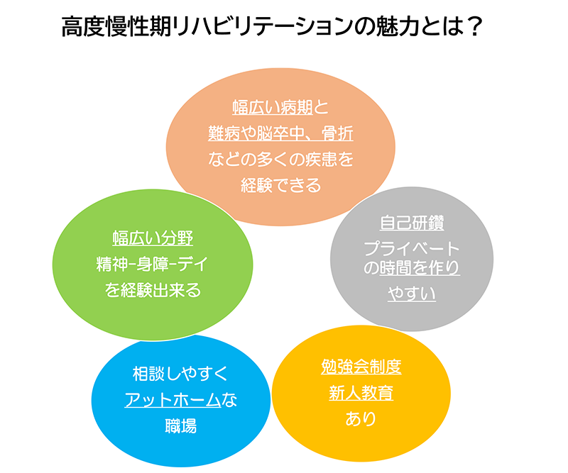 - 多くの疾患や分野を経験出来 、 入院生活のQOLを高める関わりを学ぶことができる 。