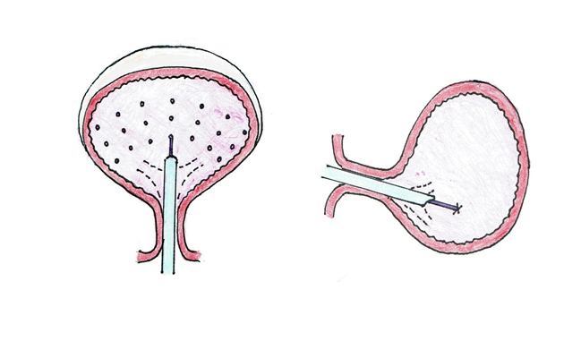 ボトックス膀胱壁内注入療法とは、A型ボツリヌストキシンという薬を内視鏡下に膀胱壁の多数箇所に少量ずつ注入することで膀胱の過剰な収縮反応を抑える治療です。