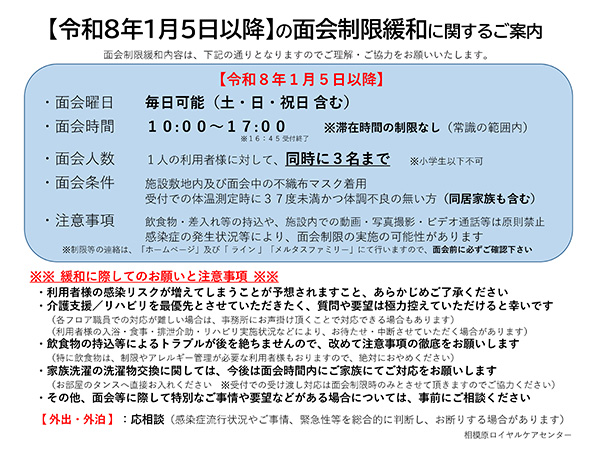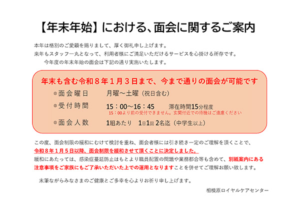 | 2020/02/14 | 面会者さまへ重要なお知らせ 詳細はこちら |