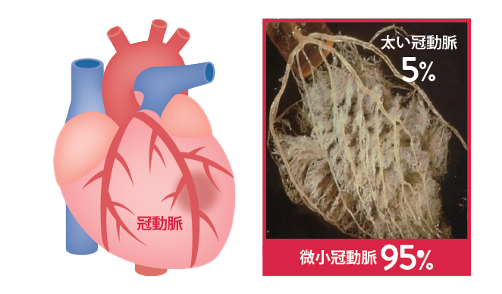 さらに冠動脈の奥深くには、心臓の血管の95%を占めると言われている微小冠動脈という細い血管が張り巡らされ、心筋のすみずみまで血液を供給しています。