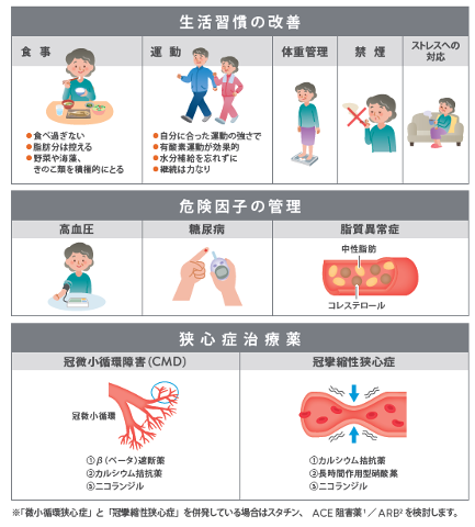 CMD診断は、今まで原因不明とされてきた胸の痛みが、冠微小循環の障害に起因しているか否かを判断する診断法です。 CMD診断の結果に基づいて、CMD陽性と診断された際には、カテーテル治療の可否に関わらず、生活習慣の改善など、心疾患のリスクを低減するための注意が必要です。 肥満を防止するために食事量や体重をコントロールし、禁煙に努め、できるだけストレスをためないように心がけましょう。 また、糖尿病や高血圧、脂質異常症(高脂血症)、痛風といった病気を持っている方は、生活習慣の改善や内服治療の順守により、それらの病気をきちんとコントロールしていきましょう。