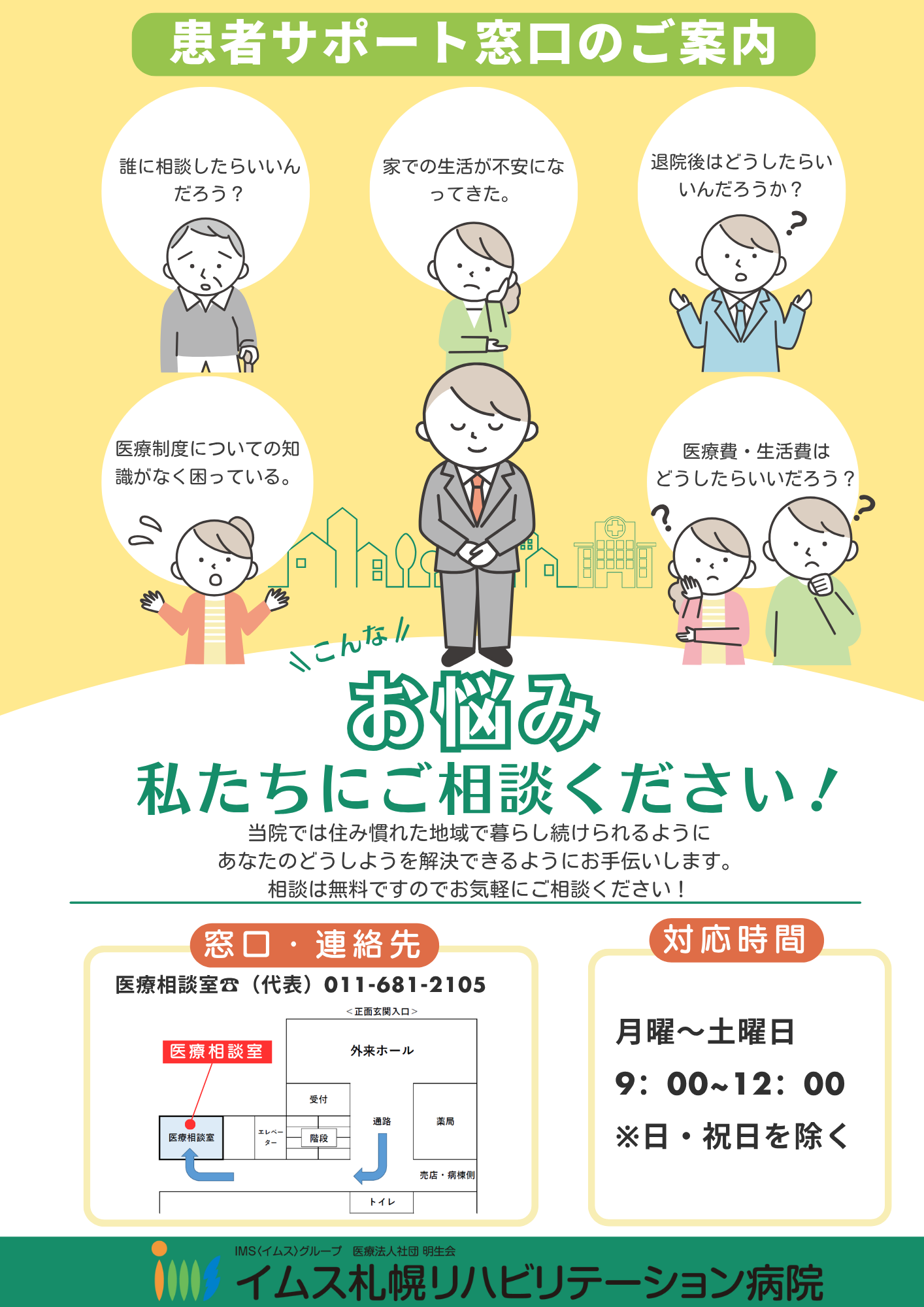 医療ソーシャルワーカーは社会福祉の専門職として、病気や怪我等により起こる様々な問題を、患者様やご家族様と一緒に考えながら、解決に向けてのお手伝いをさせていただきます。