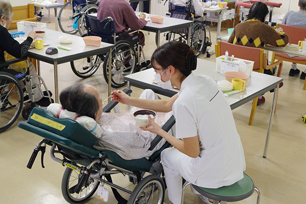 1病棟は、回復期リハビリテーション病棟の中でも、摂食嚥下リハビリテーションに積極的に取り組んでいます。脳血管疾患の後遺症や加齢に伴う嚥下機能低下、認知症により食事が進みにくい患者様など、それぞれの状態や能力に応じた支援・リハビリを行っています。食事は人にとって、栄養摂取だけでなく生活の楽しみや意欲につながる大切な時間です。当病棟では、嚥下機能が低下しても、できる限り「食の楽しみ」を保てるよう、日々工夫を重ねた取り組みを実践しています。また、毎年2~3回、季節に合わせたレクリエーションを企画し、嚥下機能に配慮した特別メニューを提供しています。夏にはたこ焼きやかき氷、冬にはクリスマスケーキやシチュー、おでんなどを取り入れ、患者様からも大変好評をいただいています。今後も、入院生活の中に少しでも楽しみと笑顔が生まれるよう、リハビリスタッフや管理栄養士と連携し、多職種協働による質の高い看護の提供に努めてまいります。