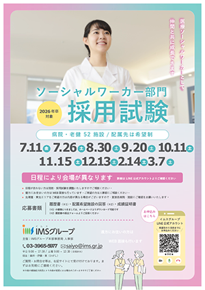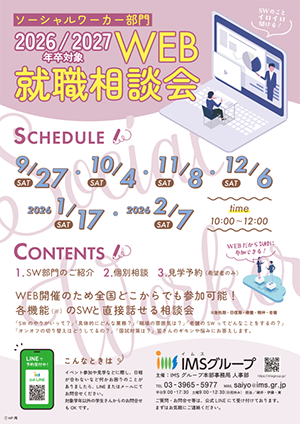 1年目は先輩SWがプリセプターとしてついて、一緒に動いて業務を覚えていきます。 イムススクールという教育プログラムがあり、ビジネスマナー等を学ぶフレッシュマンコース、ソーシャルワーカーの専門知識を学んでいくコースが、1年目に新人コース、2年目に初任者コース、以降は、中堅コースと、段階を追って学んでいくことができます。また1年目の研修を終え、2年目になったら、1年目の新人コースの研修を組み立てていく協力員になるなど、教える側も教わる方もお互いに学んでいける体制があります。