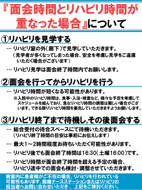 感染リスクを最小限に抑えながら円滑な入院生活を送っていただくべく、現在、リハビリ実施の際のマスク着用を原則義務化とさせていただいております。