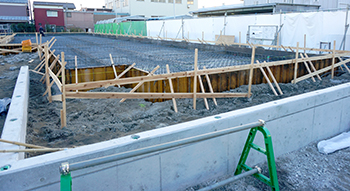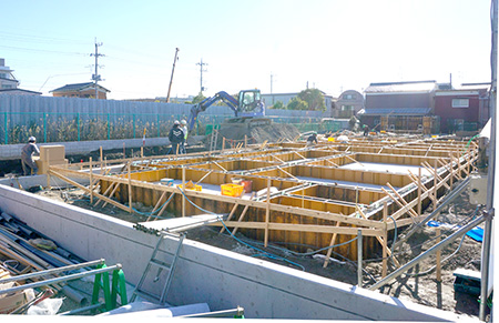 建築現場では、基礎工事と外構工事が始まり、鉄筋が組まれております。