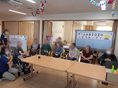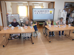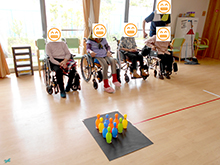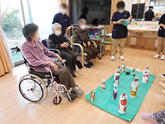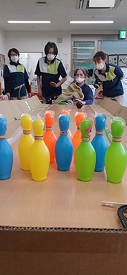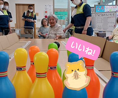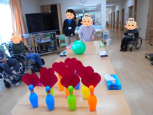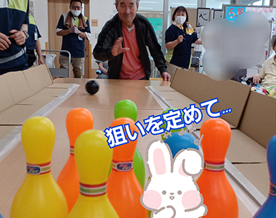 大運動会 - 10月は運動会を開催しました。ケアピリカ内のホールにてボーリング大会ともの運び競争をスタッフ交えて競いました。やはり、勝負事になると皆さんの目も変わり、やる気十分表情で開始から終了まで白熱した戦いが見れました。巷の幼稚園とかでは順位をつけないような方式が多く取れていますが、勝負をすることで普段の皆さんからは見れる真剣な表情が垣間見れました。スタッフ共にとても楽しかったです!