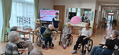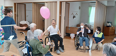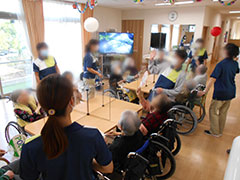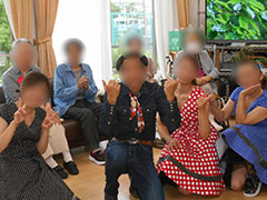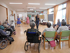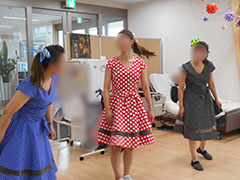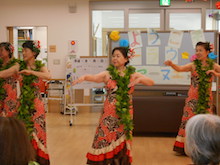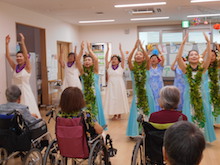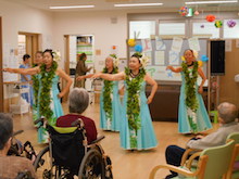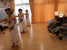 フラダンス鑑賞 - 7月はボランティアの方々をお呼びし、フラダンス鑑賞会を開催させていただきました。フラダンスを見る機会なんてそうそうないので、スタッフ、ご利用者様ともに興味津々で鑑賞されていました。ボランティアの方々もお忙しい中たくさん来ていただきまして、感謝しています。ありがとうございました。好評につき来年も開催出来たらいいなと思いました。