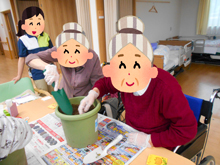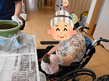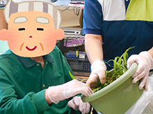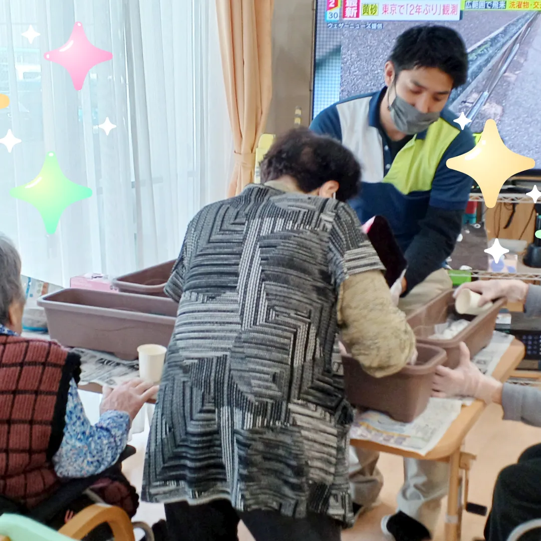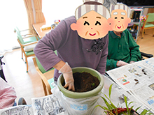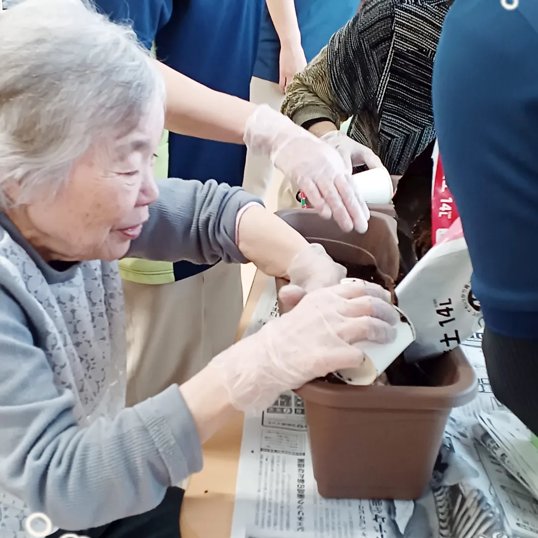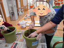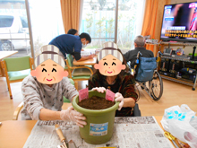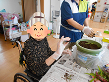 園芸療法 - 今回はケアピリカにある畑で育てる花を植えました。タンブラーを使用した簡単なものになりますが、畑をいじるという感覚がみなさん懐かしいようで、真剣に取り組んでいた様子でした。この花がしっかりと咲くように水をやるようにデイサービスに来ていただけるようなきっかけになったらいいなと感じました。