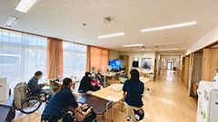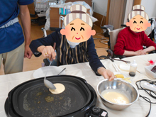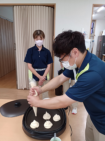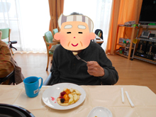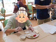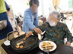 みんなでトッピングおやつレク - 今回はホットプレートを使用し、パンケーキを作りました。役という作業もみなさんでやっていただきました。そして、自分で焼いたパンケーキに自分が食べたいフルーツ等を乗っけて食べる。「いやーおいしいわねー」「選ぶの迷うっちゃうわ」など楽しそうな声が聞こえてきました。当たり前のことですが、やはり主体性が利用者様にあるということは本当に大切なんだなと再度感じました。これからもおやつレクやりましょうね!