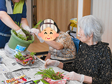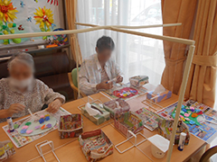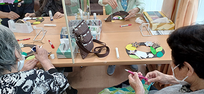 クリスマス - 今年もこの季節がやってきました!今回は、ハンドメイドリース作り体験を開催しました。手作業ってなかなか大変ですが、各利用者様のテーブルにスタッフ1名配置しサポートさせていただきました。「どこに付けようかしら」「この色のが素敵かしら」などの話し声が聞こえました。1点物のリース。今年は、玄関に飾ってみてはいかがでしょうかと思い、ご自宅へ持って帰っていただきました。スタッフ一同喜んでいただける幸いです。