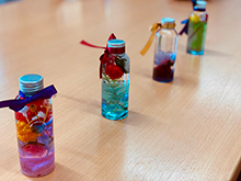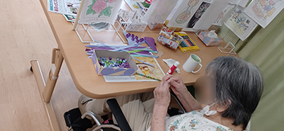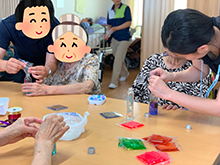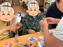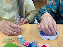 看護学生が考えるレクリエーション! - 今月も看護学生さんが実習に来ました。実習期間は短いのですが、3日間で利用者さんの様子をみてレクリエーションを展開してもらってます。今回は、学生さんがハーバリウムを皆さんで作成しようと準備から作成の流れを計画して、実行してもらいました。利用者さんからは「わーきれい!」「こんなのがあるのね!」「すてき!」などの声が上がりました。素敵なレクリエーションができて利用者、学生、スタッフ共に楽しめました。