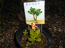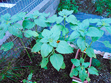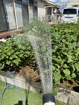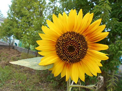 花壇には、種から育てたヒマワリ、コスモスが元気に成長しています。日照不足のためヒマワリが少々小さめですが…。これからたくさんの陽をあびて立派な花が咲くでしょう。