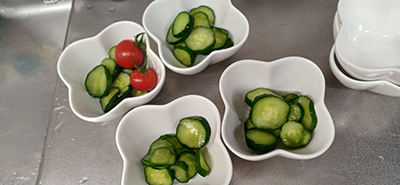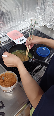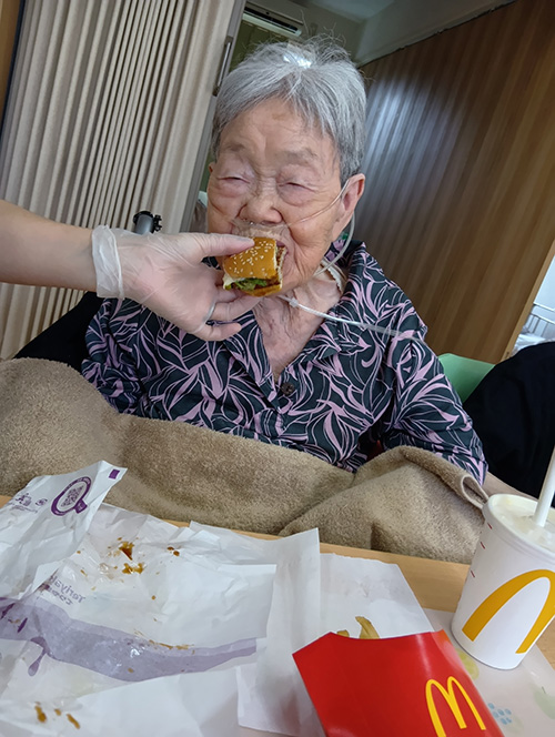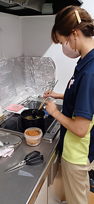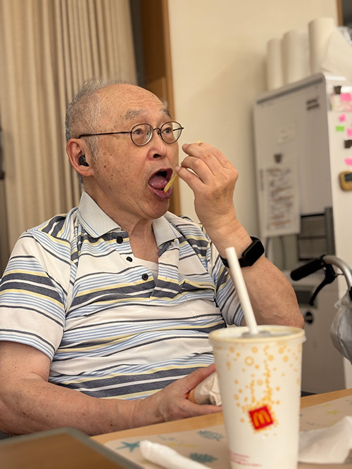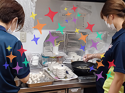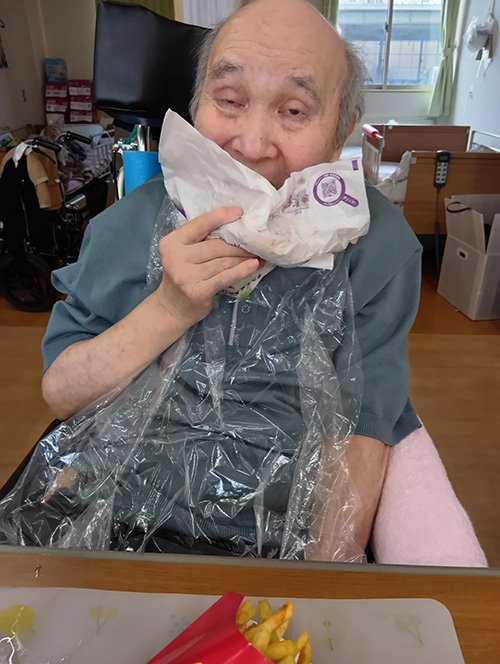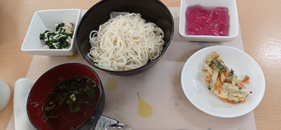 利用者さんのご飯には天丼を依頼し、取りに行きました。普段摂取量が少ない人もしっかしと食べれていました。