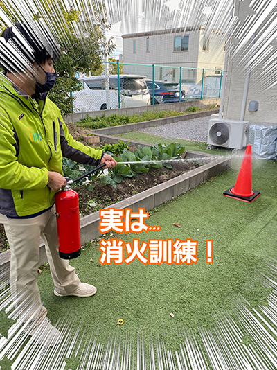 消火器の使い方もレクチャーを受け職員がそれぞれ練習をしました。